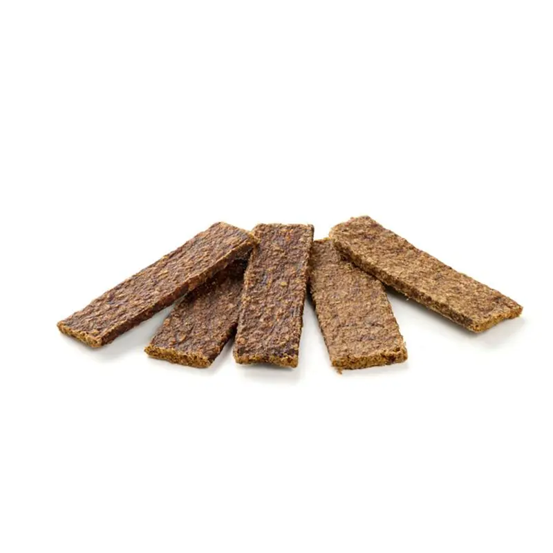 Für unsere Kaustreifen wird fein zerkleinertes Fleisch vom Pferd in Knochenform gepresst und schonend getrocknet. Ansonsten: völlig naturbelassen.