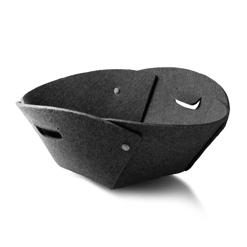 Baskit ist aus einer 8 mm starken runden Filzplatte gefertigt, die so mit Schlitzen versehen wurde, dass sie mit wenigen Handgriffen mittels der mitgelieferten Knöpfe zu einem Körbchen umgebaut werden kann – an einer Seite offen oder rundum mit schützendem Rand.