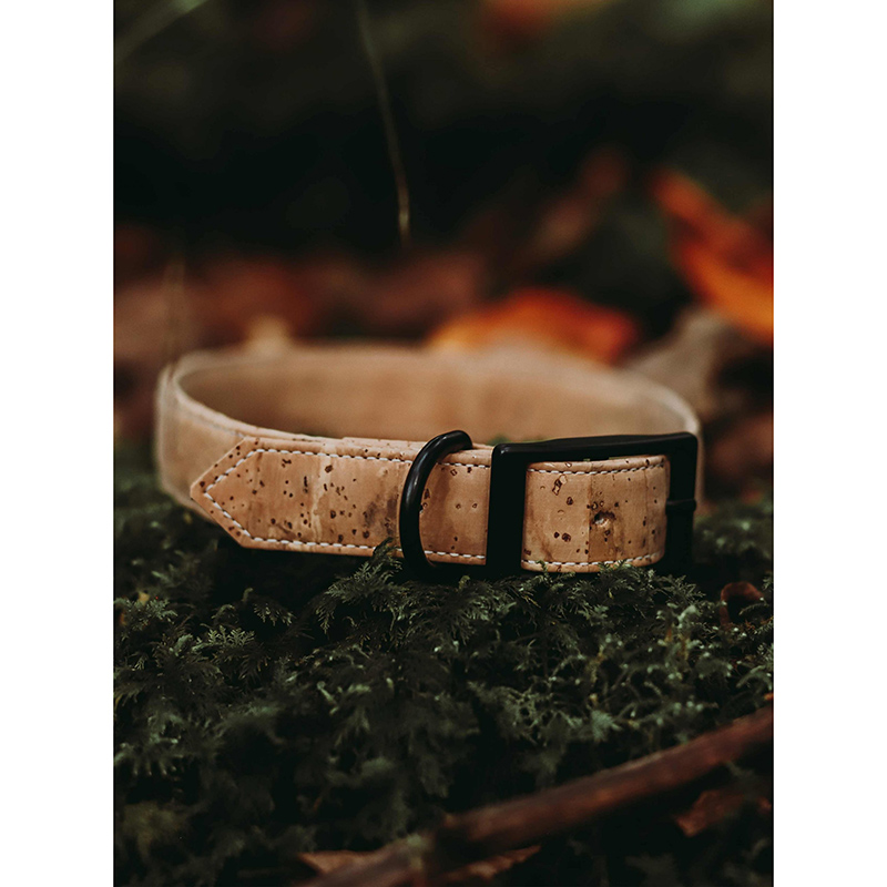 Bento Dark Glow. Das verstellbare Halsband aus Korkleder Natur mit schwarzen Beschlägen.