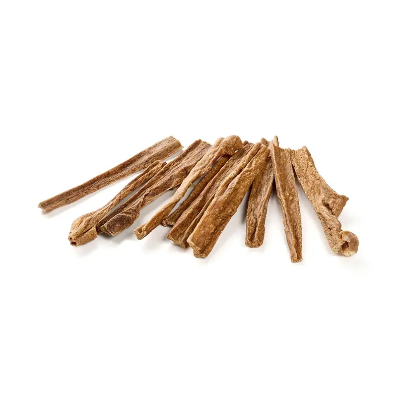 Wenn's ein bisschen mehr sein darf: der schonend getrocknete Kuheuter hat einen Fettgehalt von 30% – ideal für Hunde, die etwas mehr auf die Rippen bekommen dürfen. Die Stücke sind schön fest, aber gut zu kauen – und wie hier als Sticks auch sehr gut für kleinere Hunde zu portionieren.
