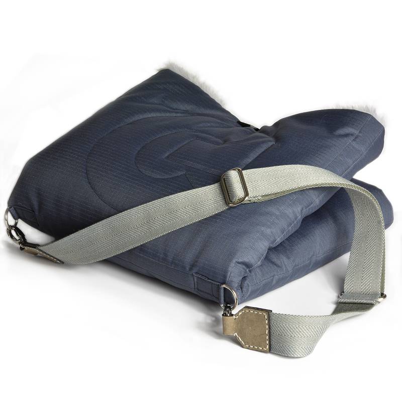 Der Taschengurt ist aus hochwertigem Doubleface-Gurtband und zur Lasche passendem, greigefarbenem Rindsleder gefertigt. Der Gurt ist individuell in der Länge verstellbar, wird mittels Karabinern an der Reisedecke befestigt und kann ebenfalls ganz einfach abgenommen werden. Einen besonderen Akzent setzt die Sattlernaht in Hellgrau.