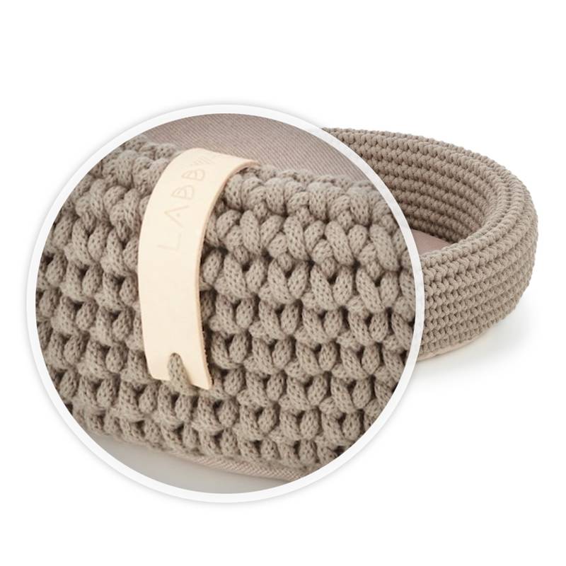 Der runde Rahmen dieses Körbchens ist von Hand aus in sich geflochtenem Garn in elegantem Camel gewebt. So entsteht ein stabiler Rand, hinter dem sich Dein kleiner Hund verstecken kann – oder das Köpfchen auflegen, um zu sehen, ob es nicht bald Essen gibt.