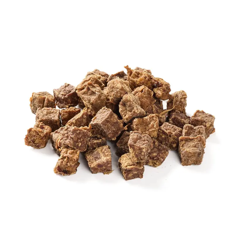Für Natur-Puristen: die Würfel-Leckerli werden aus dem Fleisch geschnitten bzw. aus kleineren Stückchen in Form gepresst und schonend getrocknet. Komplett ohne Zusatzstoffe und natürlich getreidefrei/ glutenfrei.