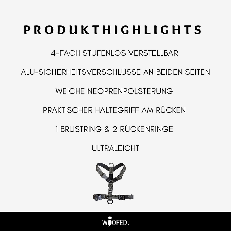 an Brust, Nacken und Rücken – für Doppelführsystem, Freizeitmodus, Schleppleine und Leinenführigkeit - Tactical Verschlüsse aus Aluminium