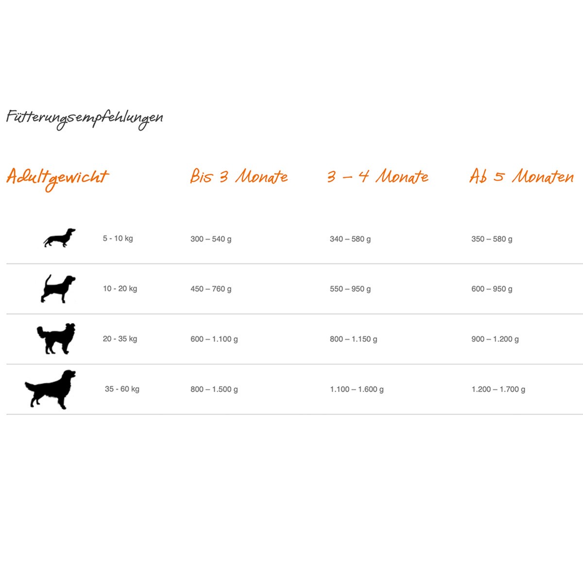 Zur Bestimmung des Tagesbedarfs Ihres Welpen können Sie sich an unserer Tabelle (s. Bild) orientieren.