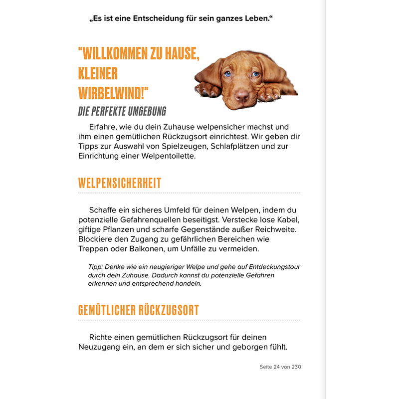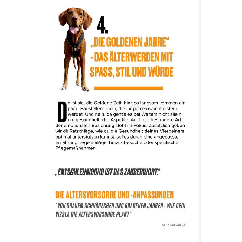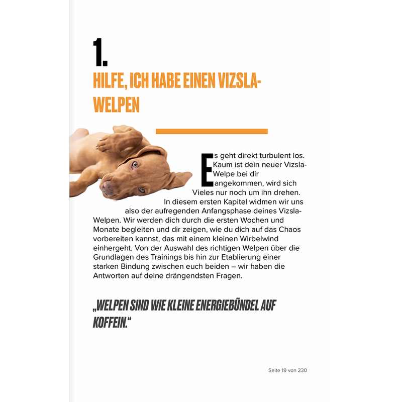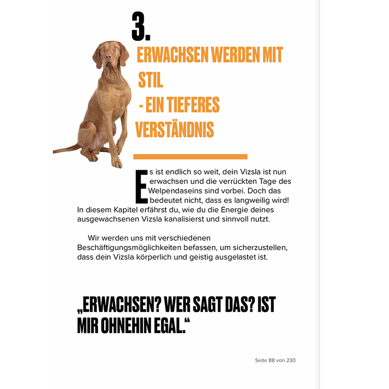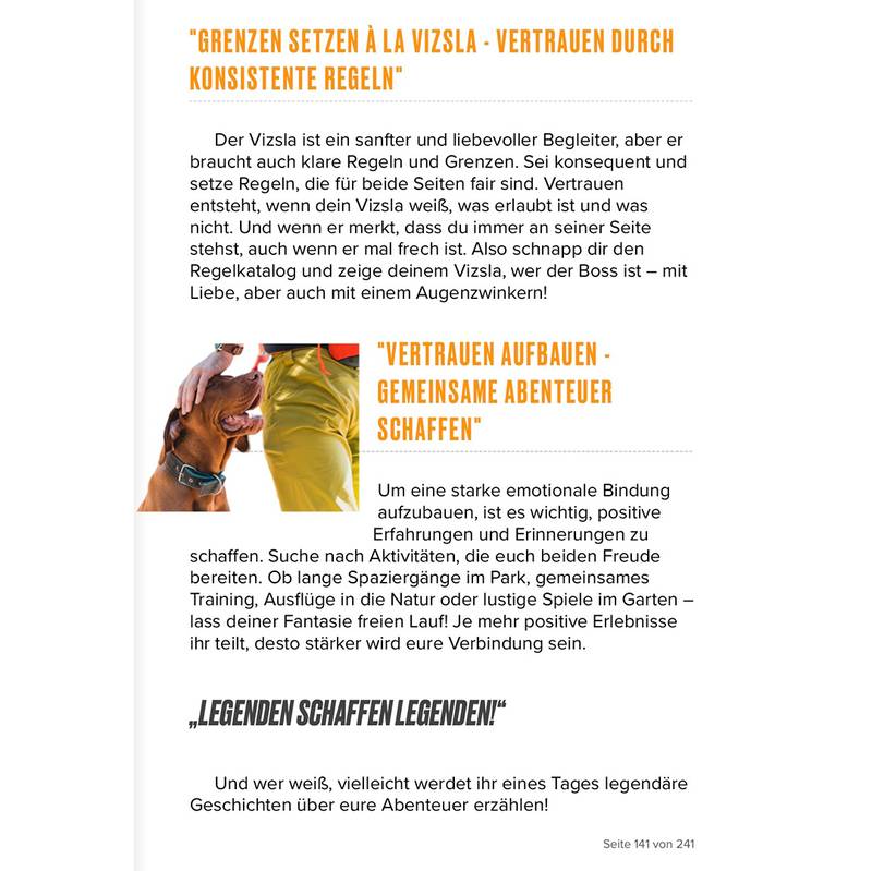 "Jeder Vizsla ist einzigartig und hat seine ganz eigenen Bedürfnisse. Nutze dieses Buch in erster Linie als Leitfaden, und verliere nie den Spaß und die Freude an der gemeinsamen Zeit mit deinem pelzigen Begleiter. Dein Vizsla wird dich mit seiner Liebe, Energie und seinem unvergleichlichen Charakter immer wieder überraschen."