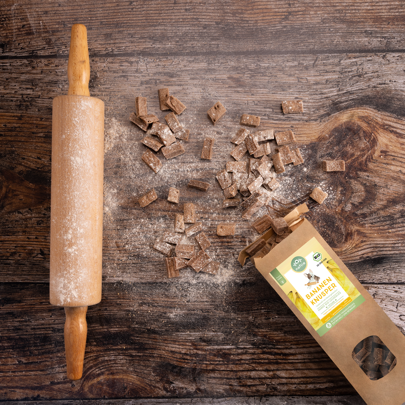 Unsere Bananen-Hundekekse werden von einem Bio-Bäcker in unserer Region bei Landsberg am Lech, im schönen Bayern, in aller Sorgfalt, von Hand und mit sehr viel Liebe gefertigt. Der Dinkel wurde von ihm extra fermentiert um die wertvollen Mineralien aufzuschließen, alle Inhaltsstoffe wurden schonend getrocknet. Natürlich werden nur feinste, biologische und meist regionale Zutaten dafür verwendet. Bananen Knusper sind etwas dunkler, die dunkle Farbe kommt von den gemahlenen Walnüssen, die feine Nase des Hundes liebt das Oregano. Die Bananenkekse sind ein idealer Snack für kleinere Hunde jeden Alters. Wichtige Nährstoffe liegen in konzentrierter Form vor.