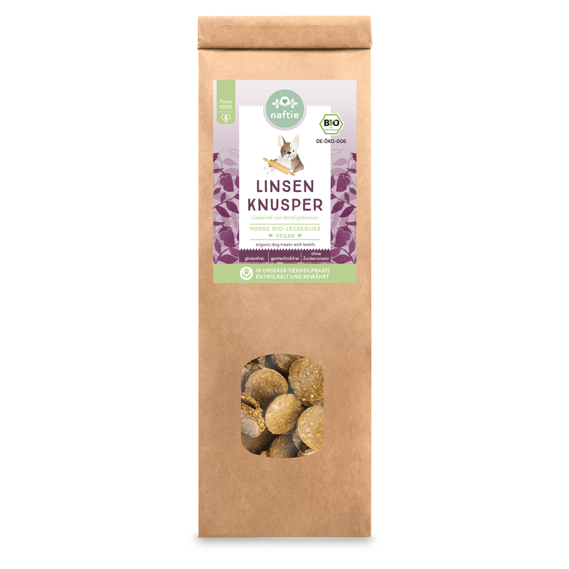 Glutenfreie Leckerlies "Linsen Knusper" aus rein natürlichen Zutaten. Vegane Leckerlis aus Bio-Buchweizenmehl, Bio-Linsenmehl, Bio-Karotten, Bio-Kokosöl, Bio-Kurkuma und Bio-Flohsamenschalen. Vegane Hundeleckerlies von naftie aus Buchweizenmehl und Linsenmehl sind lecker und gesund, mit wertvollen Mineralstoffen. Setze sie mit Bedacht beim Training oder unterwegs auf Gassirunden ein. Genau richtig sind die Bio-Leckerlies in den Momenten mit Deinem Hund, wo er etwas ganz besonders verdient hat.