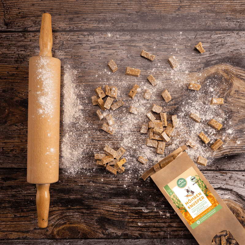 Bio-Leckerlies "Möhren Knusper" aus rein natürlichen Zutaten. Natürliche Leckerlis aus Bio-Buchweizenmehl, Bio-Karotten, Bio-Haferflocken, Bio-Olivenöl, Bio-Cumin und Bio-Flohsamenschalen. Die knusprigen naftie-Hundeleckerlies aus Buchweizenmehl mit wertvollen Mineralstoffen sind nicht nur lecker und gesund, Du kannst sie beim Training, zur Belohnung und als besonderes Leckerlie für einzigartige Momente mit Deinem Liebling einsetzen.