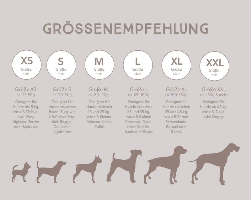 - Größe XL: ca. 160-250g, geeignet für Hunde zwischen 35 und 45 kg, wie z.B. Berner Sennenhund, Bobtail oder Barsoi