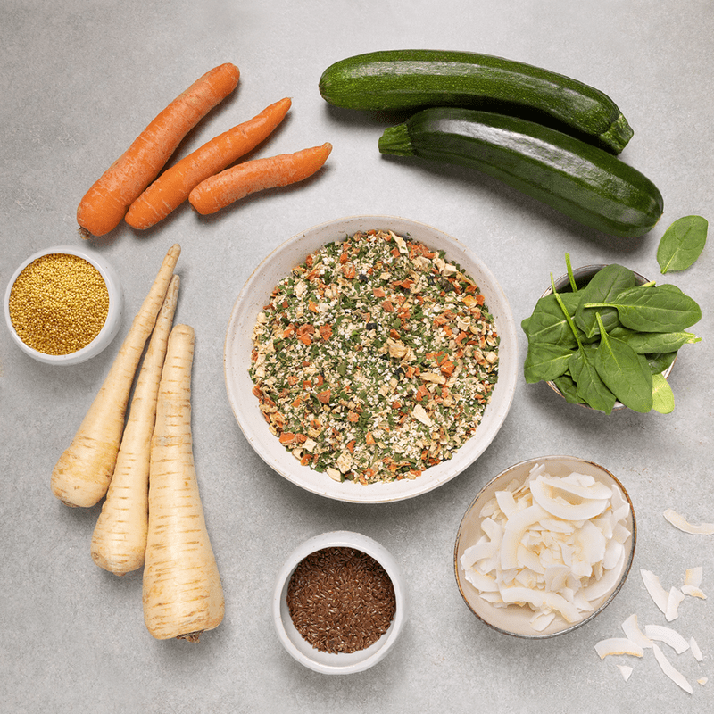 Hirseflocken *, Karottenflocken *, Leinpresskuchen *, Pastinaken *, Zucchini *, Spinat *, Kokosflocken *