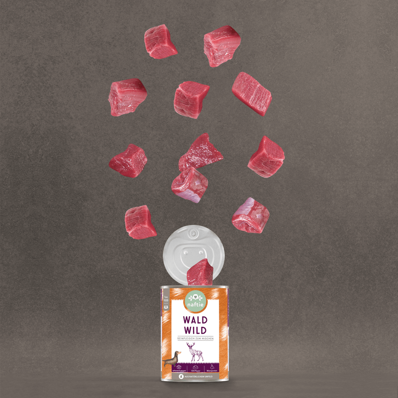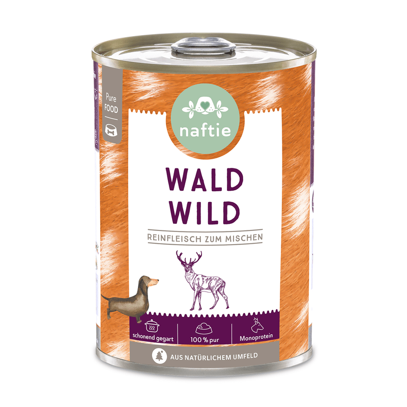 Premium Reinfleisch mit 100% Fleischanteil vom Wild, Single-Protein. Unsere Wildfleischdosen aus Muskel- und Herzfleisch sowie Lunge im iegenen Saft gegart eignen sich ideal als individueller Zusatz für selbst zubereitete Menüs, als Alternative zur Rohfleisch-Fütterung oder als Barffleisch-Ergänzung. Wichtig: Einer reinen Fleischmahlzeit fehlen für den Hund wichtige Mineralien & Vitalstoffe, diese müssen zugesetzt werden! Pures Wildfleisch aus natürlichem Umfeld. Verfügbar in 400g und 800g Dosen. Du hast auch die Möglichkeit unsere Sparpakete mit 5% Preisvorteil zu wählen.