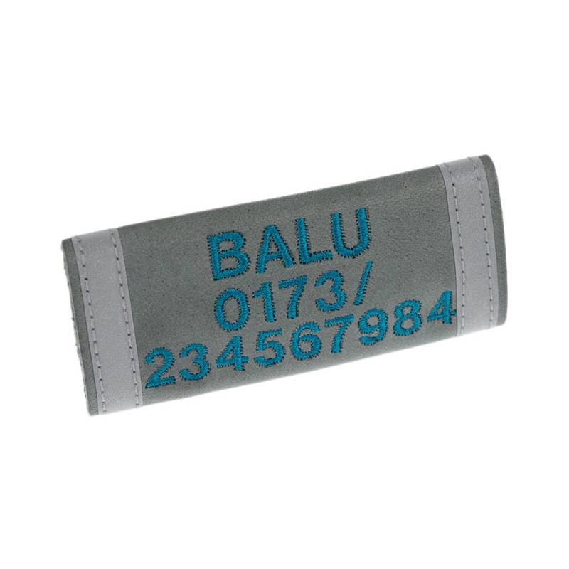 Das Halsband Cover von Dogolino® aus pflanzlich gegerbtem Leder wird mit dem Namen Deines Hundes und Deiner Telefonnummer bestickt. Dank des durchgehenden Klettverschlusses ist das Schild schnell und sicher an jedem Halsband oder Geschirr befestigt. Zwei Reflektorstreifen geben zusätzliche Sicherheit.