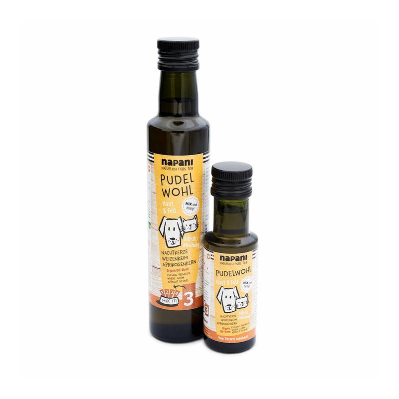 Unser kostbares Bio-Vital-Öl PUDELWOHL beinhaltet jede Menge gesunde ungesättigte Fettsäuren und kann durch seinen hohen Gehalt an Vitamin E eine positive Wirkung auf Haut und Fell ihres Lieblings haben.