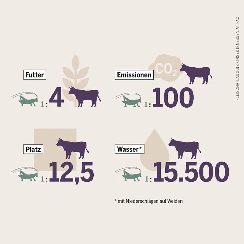 Insekten brauchen ein Viertel der Nahrung und 92% weniger Platz – dabei ist der essbare Anteil doppelt so hoch und enthält 20% mehr reines Protein (direkter Vergleich zwischen Insektenprotein und Rindfleisch, bezogen auf kg Körpergewicht). Damit ist ihr Eiweiß, aus dem sie heruntergerechnet fast zur Hälfte bestehen, ein sehr effizienter und ressourcenschonender Energielieferant.