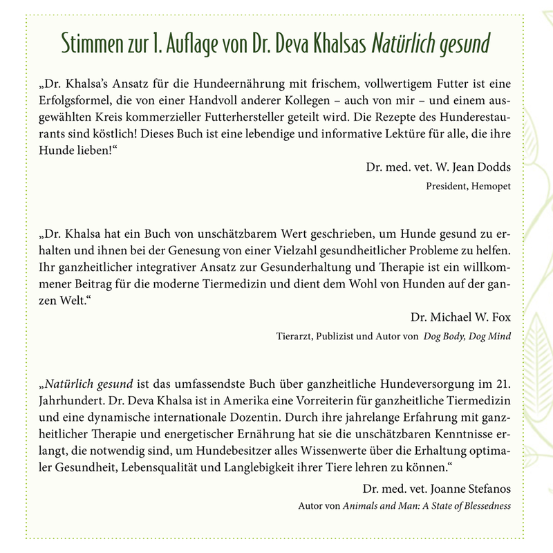 Als verantwortungsvoller Hundehalter möchten wir heute mehr denn je wissen, was in Futter, Ergänzungsstoffen und Medikamenten steckt, die wir unseren Hunden geben. Wir smöchten sie vor schädlichen Umwelteinflüssen schützen, kleinere Auas mit natürlichen Wirkstoffen und Hausmitteln behandeln – und im besten Fall mit einer gesunden und naturnahen Haltung zu einem langen Leben beitragen. Denn wie in der gesamten Natur hängt auch bei der Gesundheit des Hundes alles miteinander zusammen.