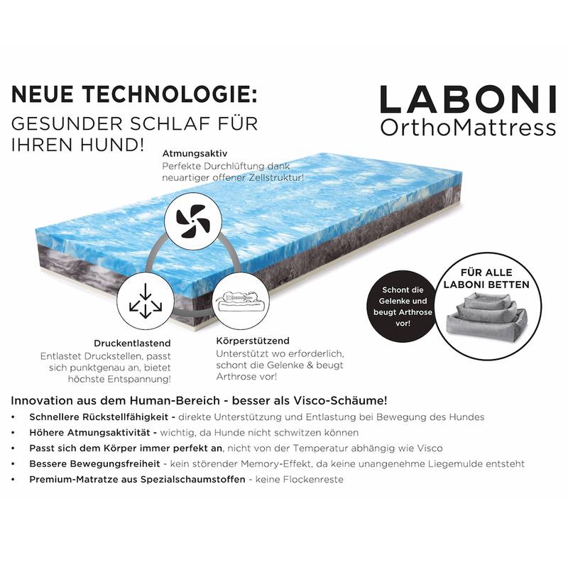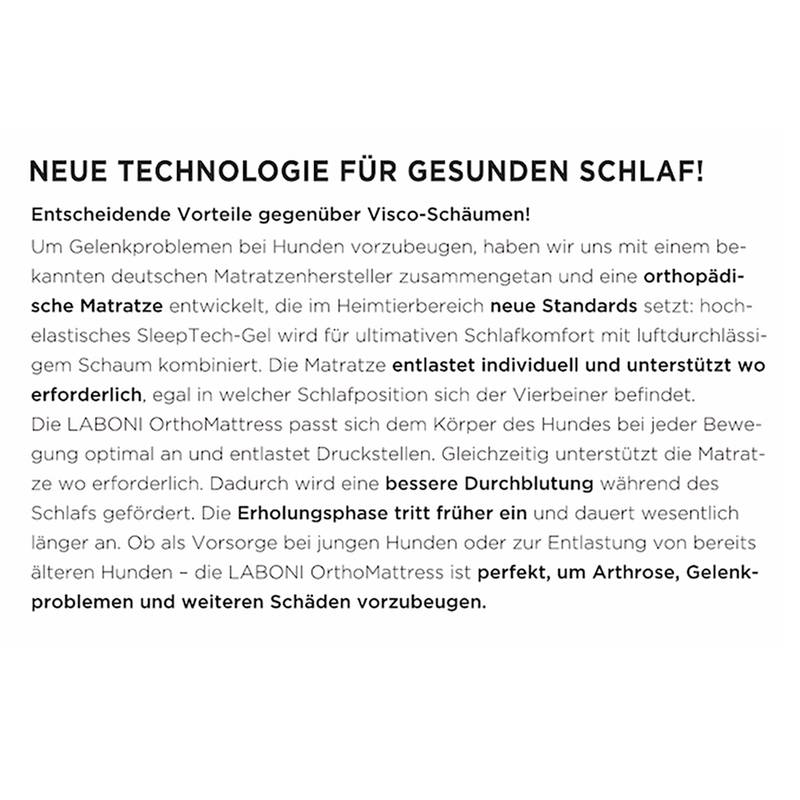 Um Gelenkproblemen bei Hunden nachhaltig vorzubeugen, haben wir von LABONI uns mit einem bekannten deutschen Matratzenhersteller zusammengetan und eine orthopädische Matratze für Hunde entwickelt, die im Heimtierbereich neue Standards setzt. Das innovative Matratzensystem überzeugt mit neuentwickelten Materialien: hoch-elastisches SleepTech-Gel wird für ultimativen Schlafkomfort mit luftdurchlässigem Schaum kombiniert. Das Ergebnis: eine Matratze, die individuell entlastet und unterstützt – dort, wo es nötig ist. Egal in welcher Schlafposition. Die obere blaue Schicht dient als nachgiebiger Topper zur Entlastung und ist fest verbunden mit dem unteren Teil aus Komfortschaum, der abstützt und garantiert, dass sich die Matratze nicht durchliegt. Ob als Vorsorge bei jungen Hunden oder zur Entlastung von bereits älteren Hunden – die LABONI OrthoMattress ist die perfekte Prophylaxe gegen Gelenkprobleme und weitere Schäde bei diagnostizierter Arthrose, Hüftdysplasie (HD), Ellenbogendysplasie (ED) oder Beschwerden bedingt durch Verschleiß an der Wirbelsäule (Spondylose).