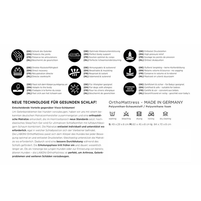 Um Gelenkproblemen bei Hunden nachhaltig vorzubeugen, haben wir von LABONI uns mit einem bekannten deutschen Matratzenhersteller zusammengetan und eine orthopädische Matratze für Hunde entwickelt, die im Heimtierbereich neue Standards setzt. Das innovative Matratzensystem überzeugt mit neuentwickelten Materialien: hoch-elastisches SleepTech-Gel wird für ultimativen Schlafkomfort mit luftdurchlässigem Schaum kombiniert. Das Ergebnis: eine Matratze, die individuell entlastet und unterstützt – dort, wo es nötig ist. Egal in welcher Schlafposition. Die obere blaue Schicht dient als nachgiebiger Topper zur Entlastung und ist fest verbunden mit dem unteren Teil aus Komfortschaum, der abstützt und garantiert, dass sich die Matratze nicht durchliegt. Ob als Vorsorge bei jungen Hunden oder zur Entlastung von bereits älteren Hunden – die LABONI OrthoMattress ist die perfekte Prophylaxe gegen Gelenkprobleme und weitere Schäde bei diagnostizierter Arthrose, Hüftdysplasie (HD), Ellenbogendysplasie (ED) oder Beschwerden bedingt durch Verschleiß an der Wirbelsäule (Spondylose).