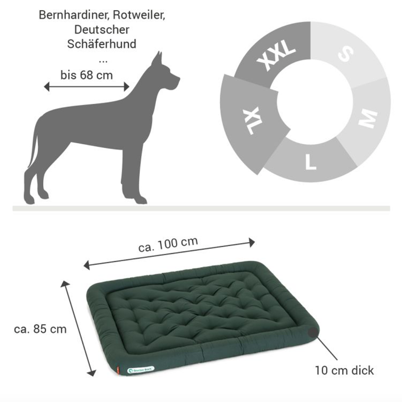 - XXL – Maße: ca. 115 x 100 x 10 cm für sehr große Hunde wie Bernhardiner, Deutsche Dogge, Barsoi.