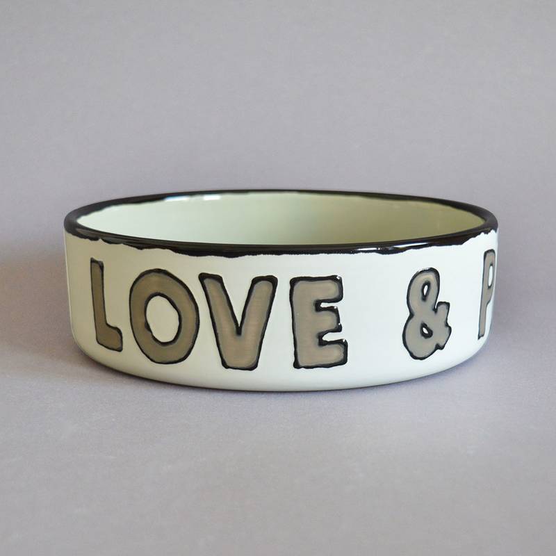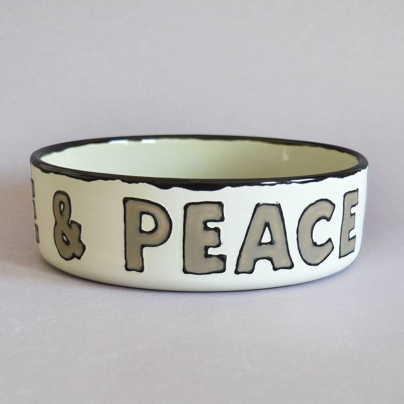 Der Love & Peace Napf ist innen Salbei und außen Antikweiß mit Schrift in Taupe.