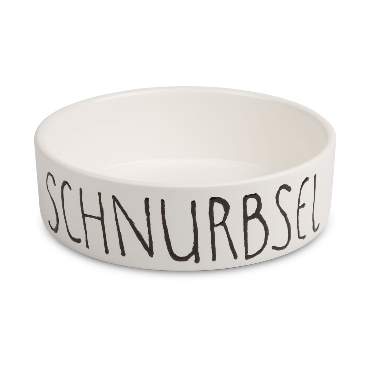 Ein von Hand bemalter Keramiknapf mit individuellem Text mit matt weißer Glasur außen und glänzender innen. Die Schrift ist schwarz.