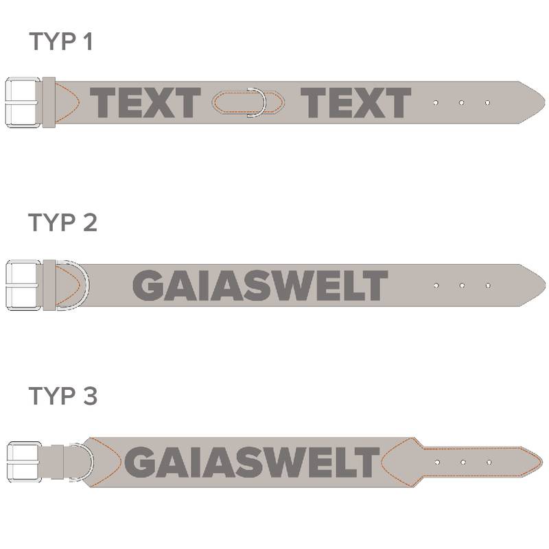 Typ 3 mit schmalem Verschluss und Ring bei der Schnalle - der Name wird mittig appliziert. Die Halsbandbreite beträgt 5 cm, die Breite am Verschluss 3 cm.