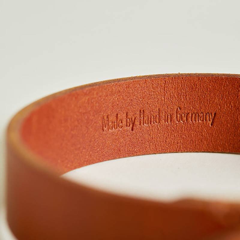 Gutes Design beginnt mit der Materialauswahl und findet seinen Höhepunkt in der Verarbeitung: dieses Halsband ist aus besonders robustem, dabei aber weichem Satteltaschenleder aus Europa gefertigt, das im Laufe der Jahre eine wunderbare Patina entwickeln wird. Die Kanten des Riemens sind gebrochen und poliert und reiben nicht am Hundehals.
