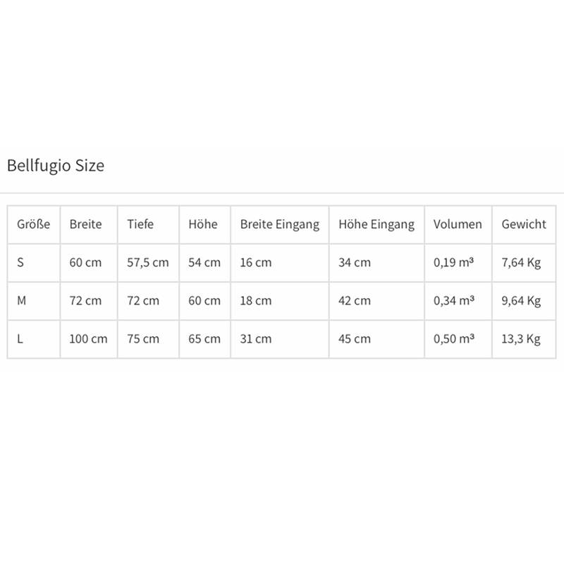 Maße Größe M | Breite 72 cm | Tiefe 72 cm | Höhe 60 cm | Breite Eingang 18 cm | Höhe Eingang 42 cm.