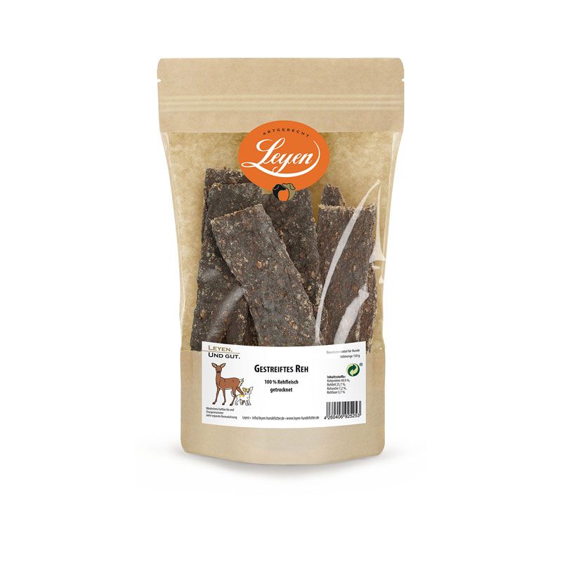 Kaustreifen aus 100 % getrocknetem Rehfleisch – und sonst nix. Keine weiteren Zutaten.