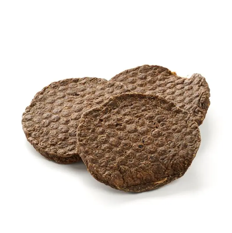 Bei der Herstellung unserer Patties fällt auch Verschnitt und Bruch an, den wir hier mit verpacken (bis zu 25 %). Das hat auch einen Grund: die Herstellung mit reinem Fleisch ohne Zusatzstoffe lässt leider kein stabileres Endprodukt zu. Auch der geringe Fett- und Feuchtigkeitsanteil lässt die Kauknochen gerne brechen.