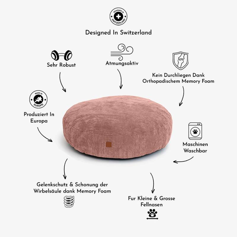 Roi ist ein rundes Hundekissen mit Cordbezug, das nicht nur super gemütlich aussieht, sondern auch innere Werte zu bieten hat: