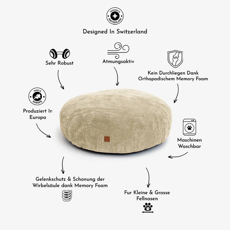Roi ist ein rundes Hundekissen mit Cordbezug, das nicht nur super gemütlich aussieht, sondern auch innere Werte zu bieten hat: