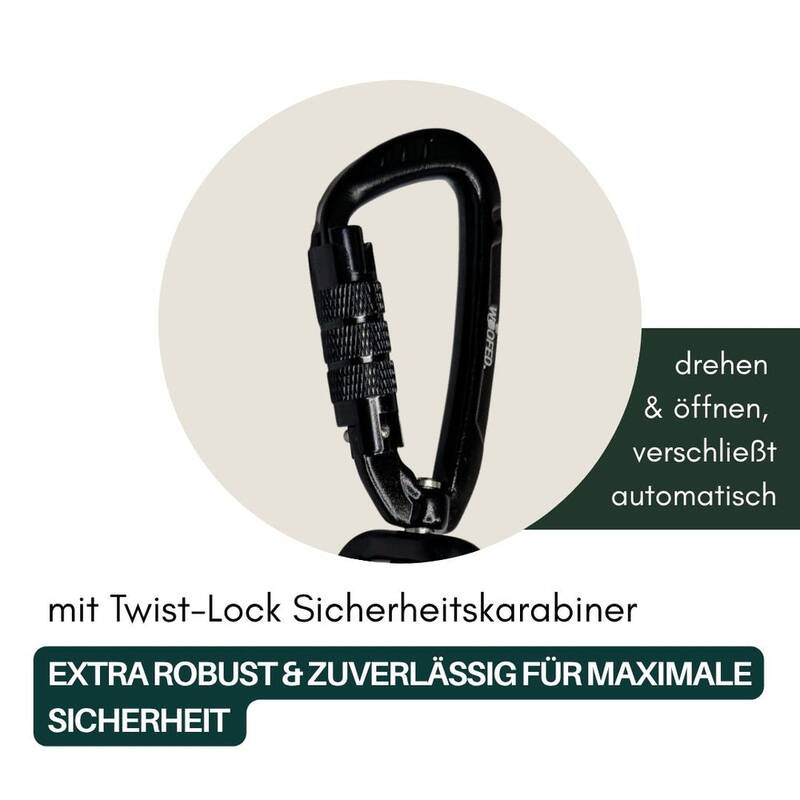 Der verwendete Karabiner ist extra bruchfest und hat einen Twist-Lock-Karabiner, der sich nur durch Drehen öffnen lässt und von selbst wieder schließt.