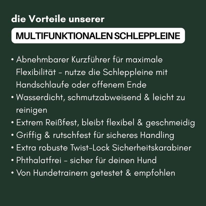 Die PRO Schleppleine mit Sicherheitskarabiner in klassischem Dunkelgrün ist sowohl zum Mantrailing bestens geeignet, als auch zum Sichern eines jeden Hundes während der Schonzeit bzw. überhaupt, wenn der Rückruf (gerade/ noch) nicht so richtig sitzt.