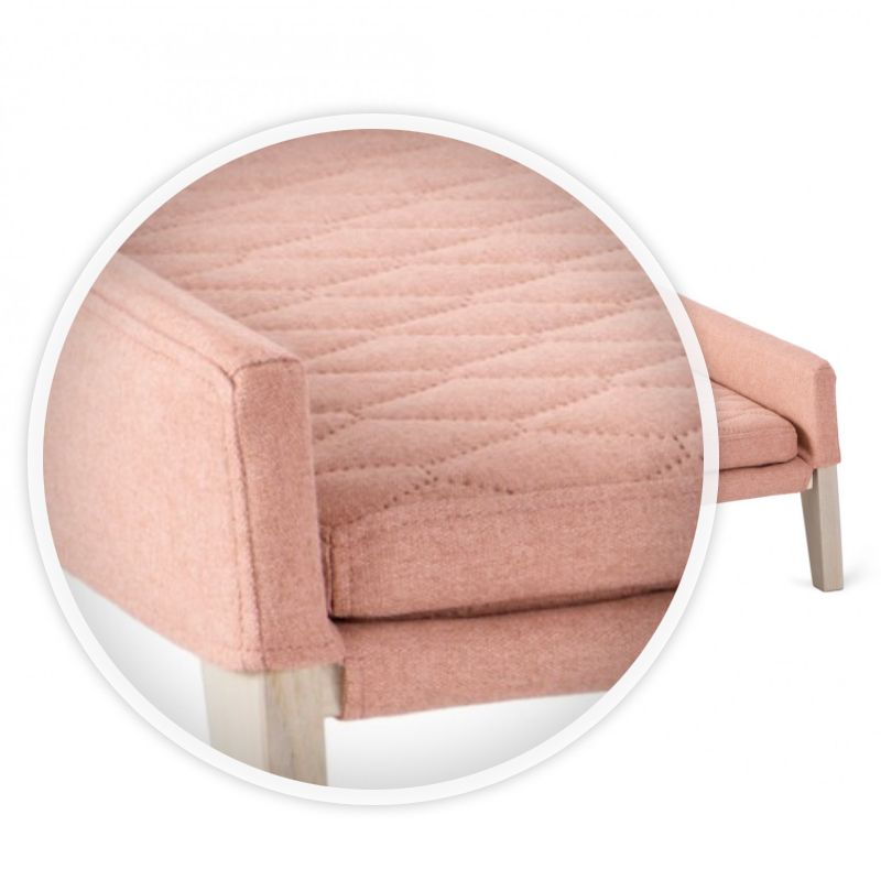 Die schlichte Eleganz der Form wird durch die Auswahl der Materialien – massives Eschenholz und fein gewebter, aber robuster Polsterstoff in zartem Raspberry – und die makellose Verarbeitung besonders hervorgehoben.