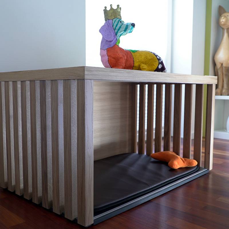 Die Indoor Hundehütte "Klingelpütz" von Pudeldesign® wird in einer deutschen Möbelmanufaktur entworfen und in kleinen Auflagen aus hochwertigem Eichenholz gebaut.