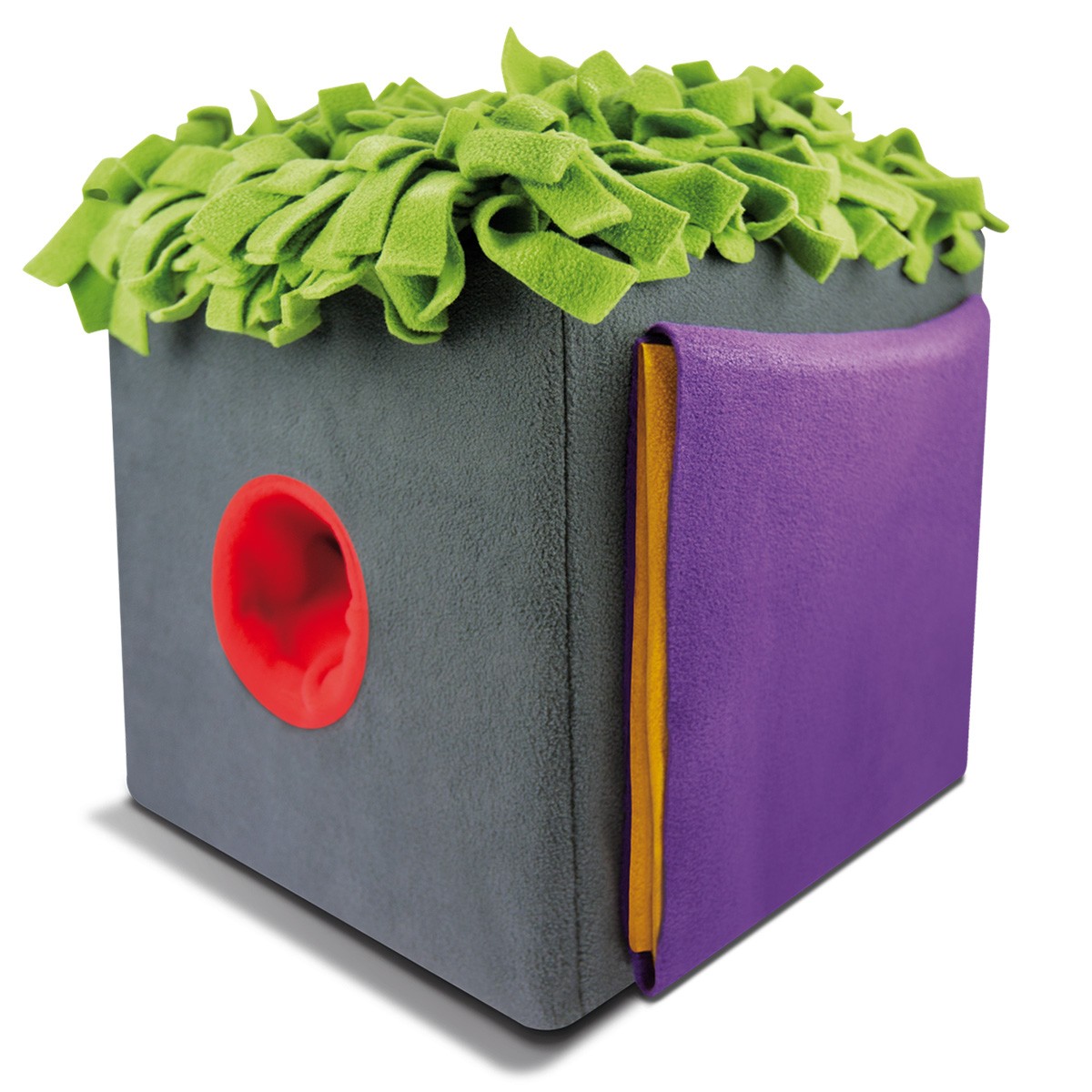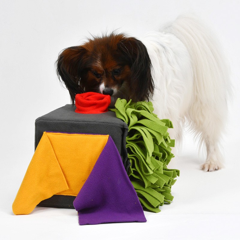 Die phantasievoll bunte Box mit einer Basis aus stabilem Karton mit einer abnehmbaren, pflegeleichten Fleece-Spielfläche bringt kunterbuntes Vergnügen in den Hundealltag. Ob zu Hause oder im Büro – mit der Sniffbox kommt keine Langeweile auf.