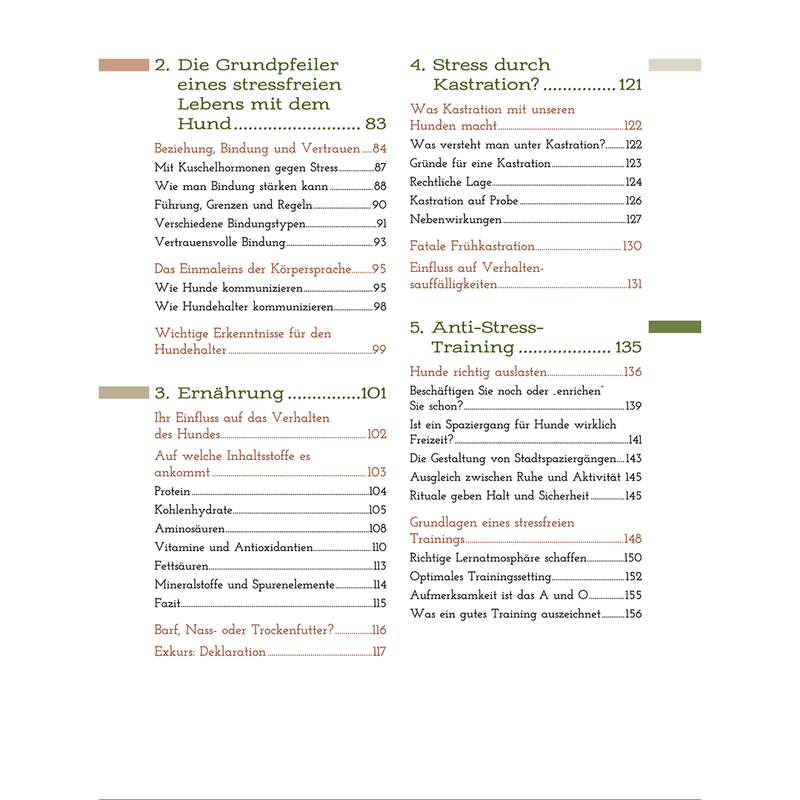 Die Ursachen und teils massiven Folgen von Stress werden ebenso beschrieben wie die Einflüsse von Ernährung und Kastration auf unsere Hunde.