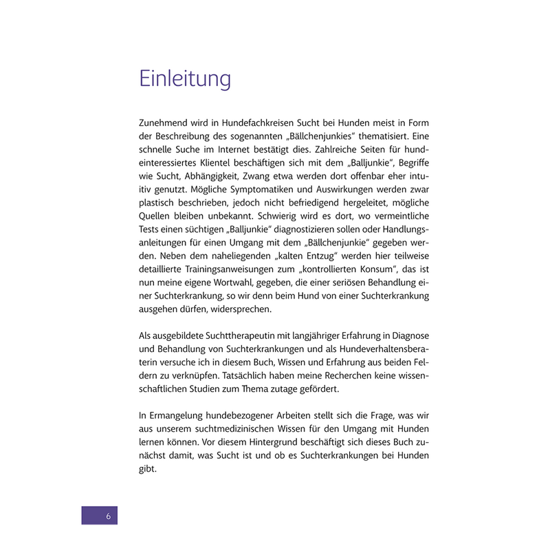 Die Autorin verbindet ihre Kompetenz und Erfahrung als Suchttherapeutin für Menschen mit ihrem Wissen als Hundeverhaltensberaterin, um erfahrenen Hundemenschen und Fachleuten neue Einsichten, Ideen und Handlungsansätze für ein lange unterschätztes Problem zu liefern.