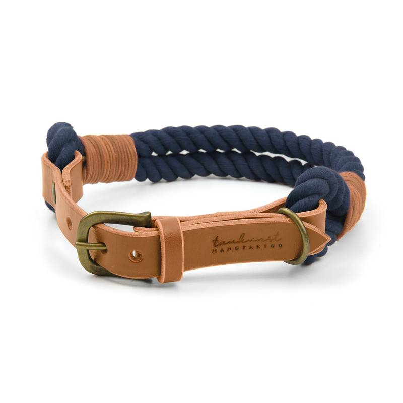 Griffiges Baumwolltau in Kombination mit kernigem Leder, ergänzt mit hochwertigen Beschlägen – mit diesem handgefertigten Halsband aus der Münchner taukunst Manufaktur schenkst Du Deinem Hund ein echtes Schmuckstück!