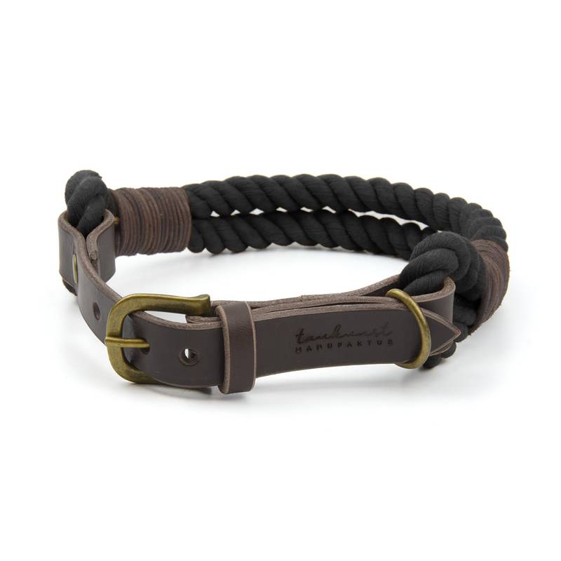 Griffiges Baumwolltau in Kombination mit kernigem Leder, ergänzt mit hochwertigen Beschlägen – mit diesem handgefertigten Halsband aus der Münchner taukunst Manufaktur schenkst Du Deinem Hund ein echtes Schmuckstück!