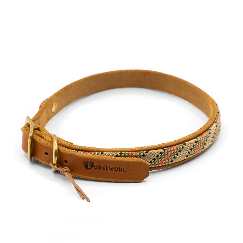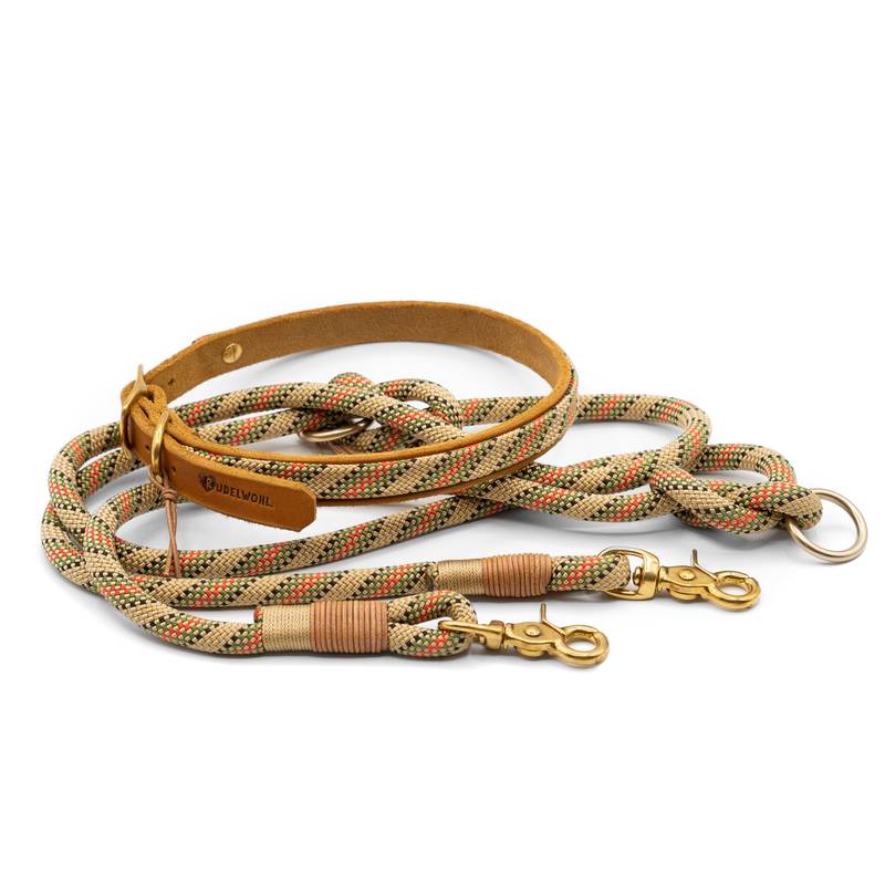 Verstellbares Halsband aus butterweichem Fettleder in Cognac kombiniert mit dem Kletterseil "Uschi".