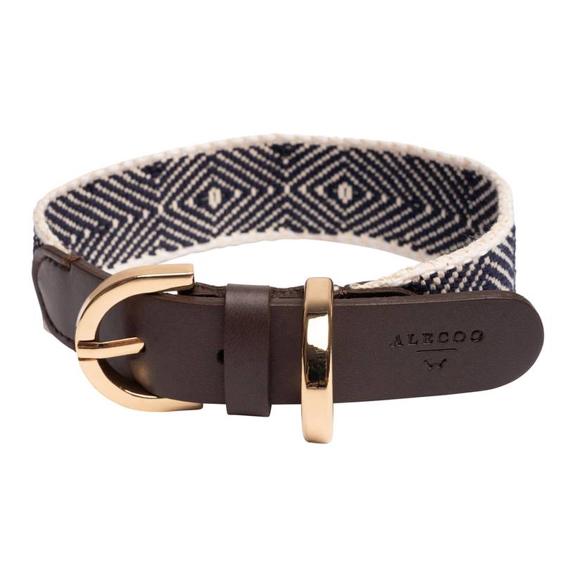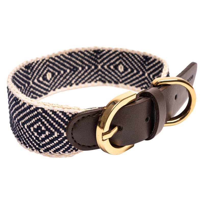 So ist Dein Hund entspannt und stilbewusst unterwegs. Das Halsband aus weichem Baumwollband mit folkloristischem Rautenmuster in Dunkelblau und Crèmeweiß ist mit 35 mm besonders breit und schmiegt sich so ganz natürlich an den Hals.