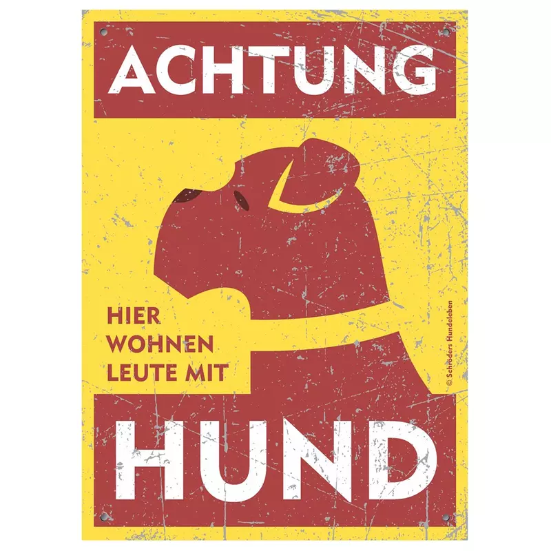 Graphisch klare Gestaltung in den Signalfarben Rot und Gelb macht das Hundeschild quasi unübersehbar. Die im Motiv enthaltene "Patina" verleiht dem Schild einen charmanteren Look.