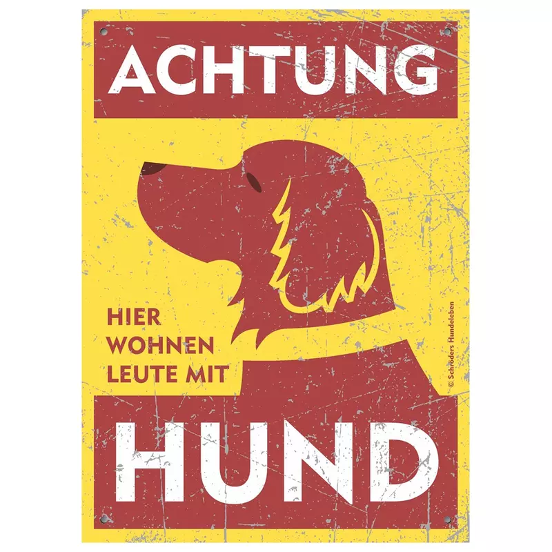 Graphisch klare Gestaltung in den Signalfarben Rot und Gelb macht das Hundeschild quasi unübersehbar. Die im Motiv enthaltene "Patina" verleiht dem Schild einen charmanteren Look.