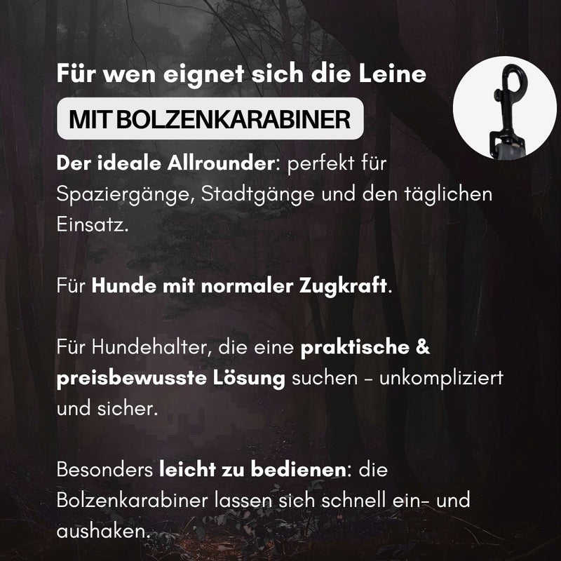 | Bolzenkarabiner | Phlegmatiker bis lebhafte, aber "normal" leinenführige Hunde | CLASSIC |