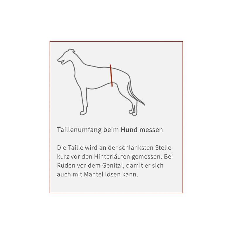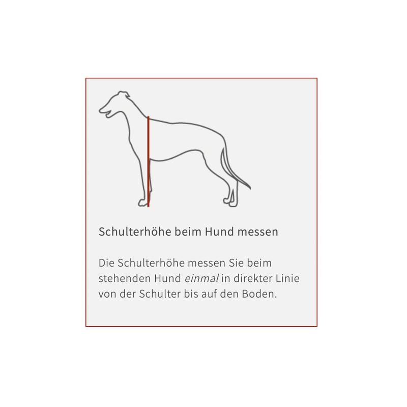 Dein Hund sollte zum Ausmessen ruhig stehen. Bitte beachte die Messanleitung und nimm die Maße gemäß der entsprechenden Abbildung ab. Am besten geht das mit einem Schneidermaßband, das Du nur leicht anlegst und nicht zu straff ziehst – ein Zeigefinger sollte noch darunter passen.