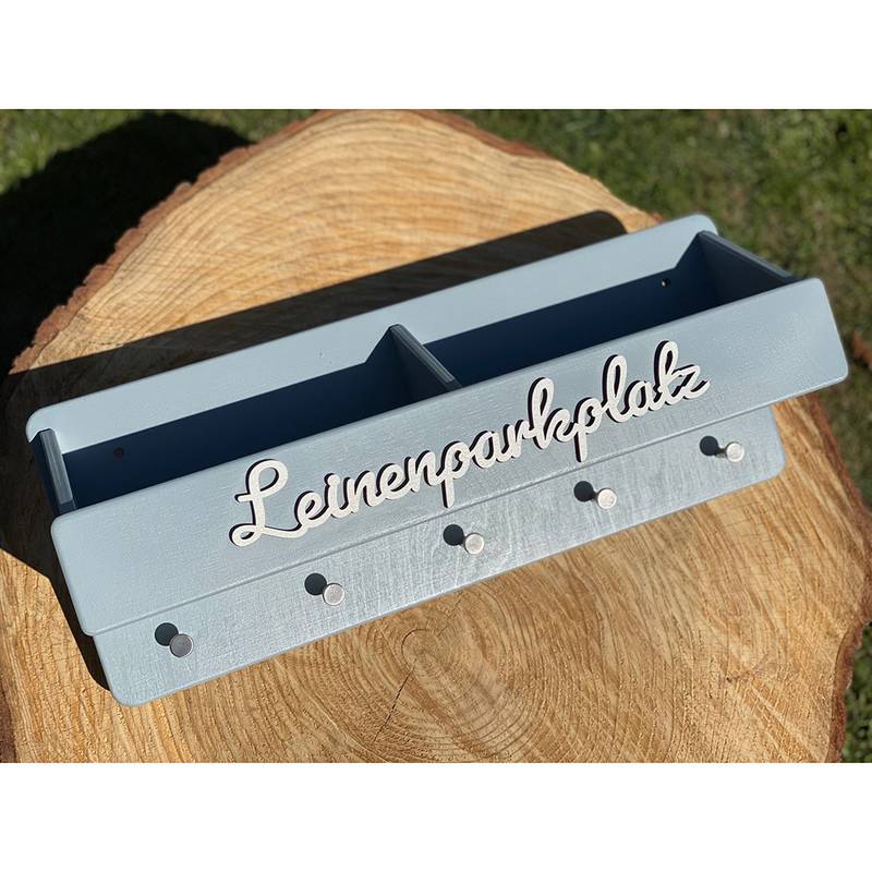 Die Box hat innen eine Tiefe von 9 cm und nimmt allerlei Kleinkram auf. An den fünf Edelstahlhaken darunter finden Leinen und Halsbänder Platz.