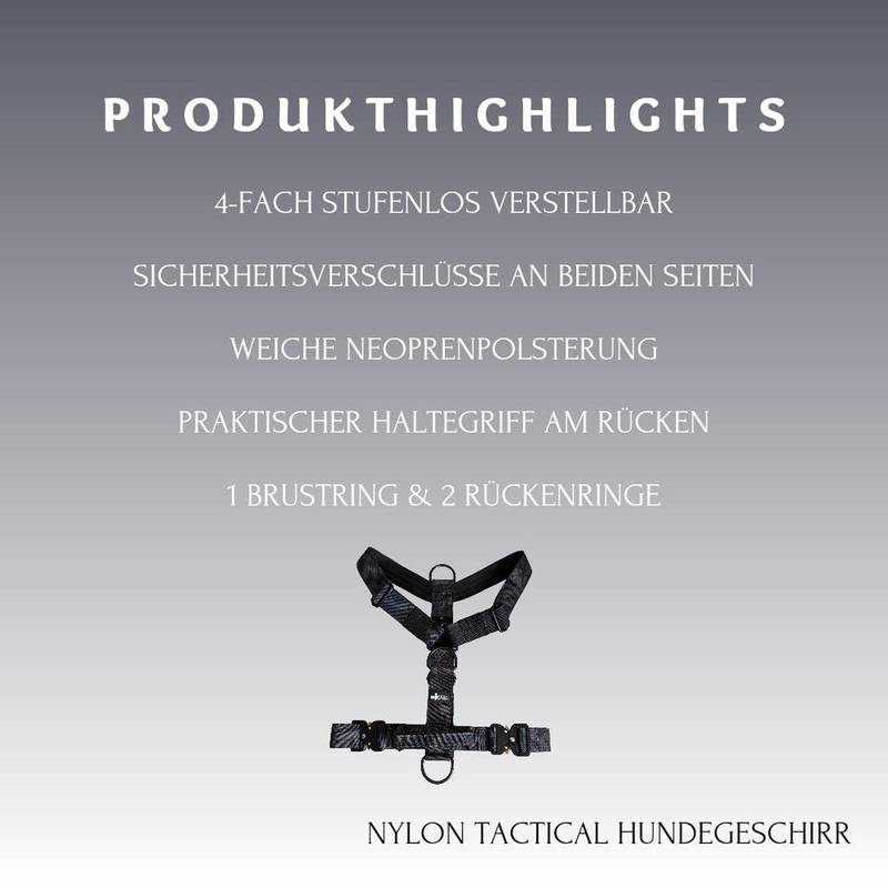 Stufenlos verstellbar. Drei Ringe zur Leinenbefestigung. Breite Gurte, gepolstert mit Neopren. Tactical Karabiner. Camouflage black. Kostenloser Versand.