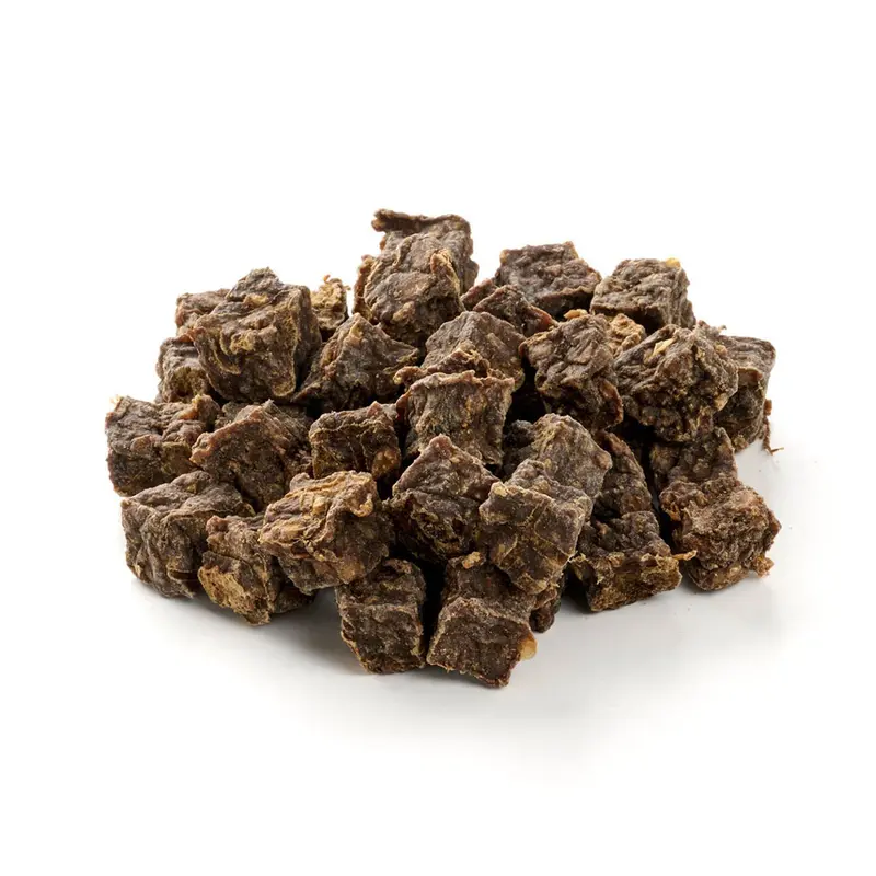 Für Natur-Puristen: die Würfel-Leckerli werden aus dem Fleisch geschnitten bzw. aus kleineren Stückchen in Form gepresst und schonend getrocknet. Komplett ohne Zusatzstoffe und natürlich getreidefrei/ glutenfrei.
